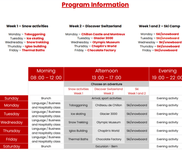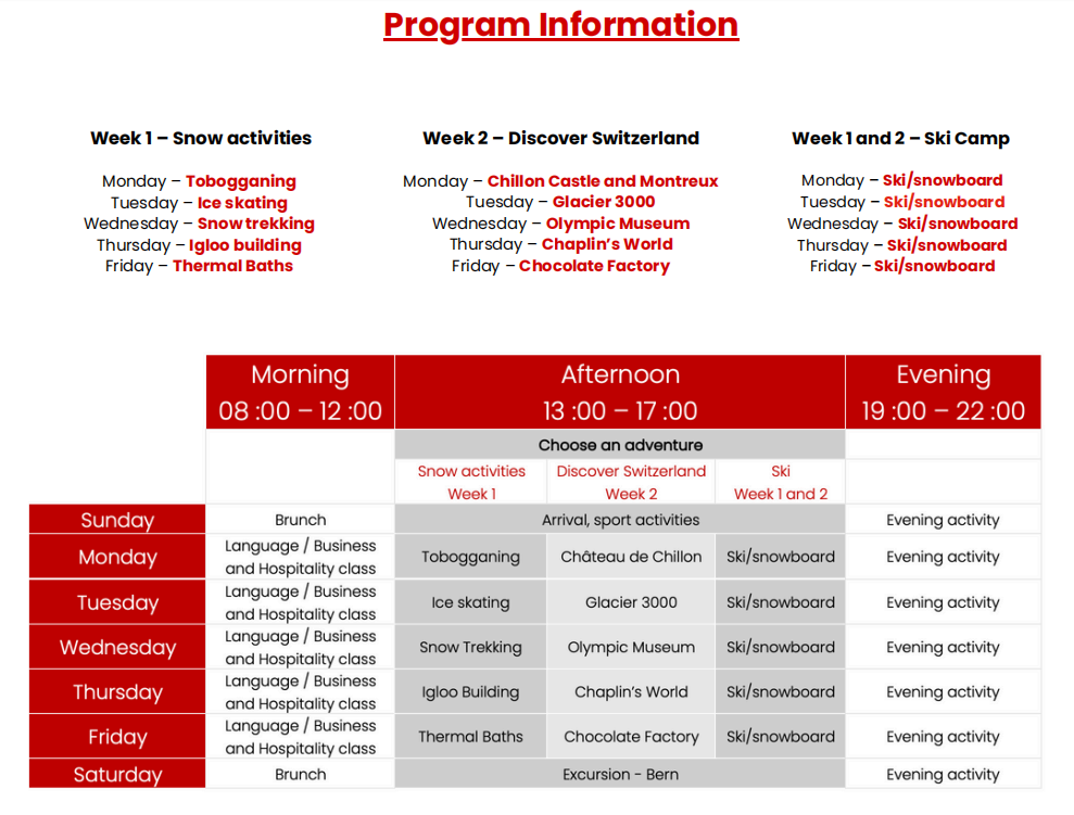 Perkemahan Musim Dingin ini pasti akan menjadi pengalaman yang tak terlupakan. Tingkatkan kemampuan bahasa atau pemahaman Kamu tentang dunia bisnis dan perhotelan, dan ikuti berbagai kegiatan seru bersama teman-teman baru dari seluruh dunia, sambil dikelilingi oleh Pegunungan Alpen Swiss yang megah.